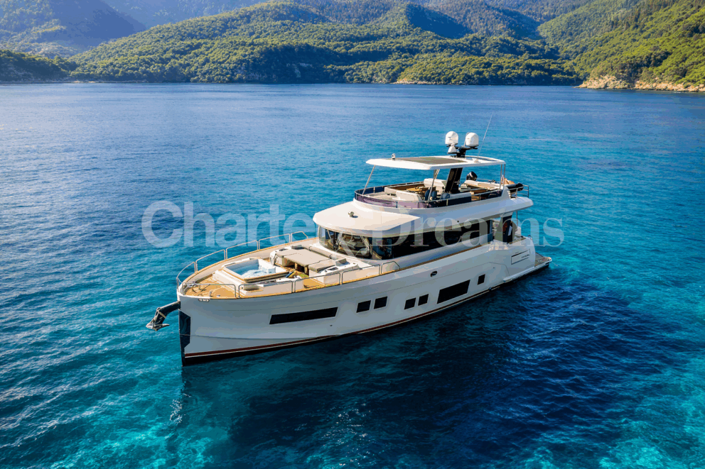 Diseñada para disfrutar del estilo de vida mediterráneo, esta Sirena 64 ofrece excelentes espacios interiores y exteriores, incluyendo jacuzzi y zonas de relax para disfrutar del sol y las vistas al mar. Sus estabilizadores tanto en navegación como en fondeo garantizan el máximo confort, mientras que su velocidad de crucero de 16 nudos (máxima 27 nudos) permite desplazamientos ágiles entre Mallorca, Ibiza y Formentera.