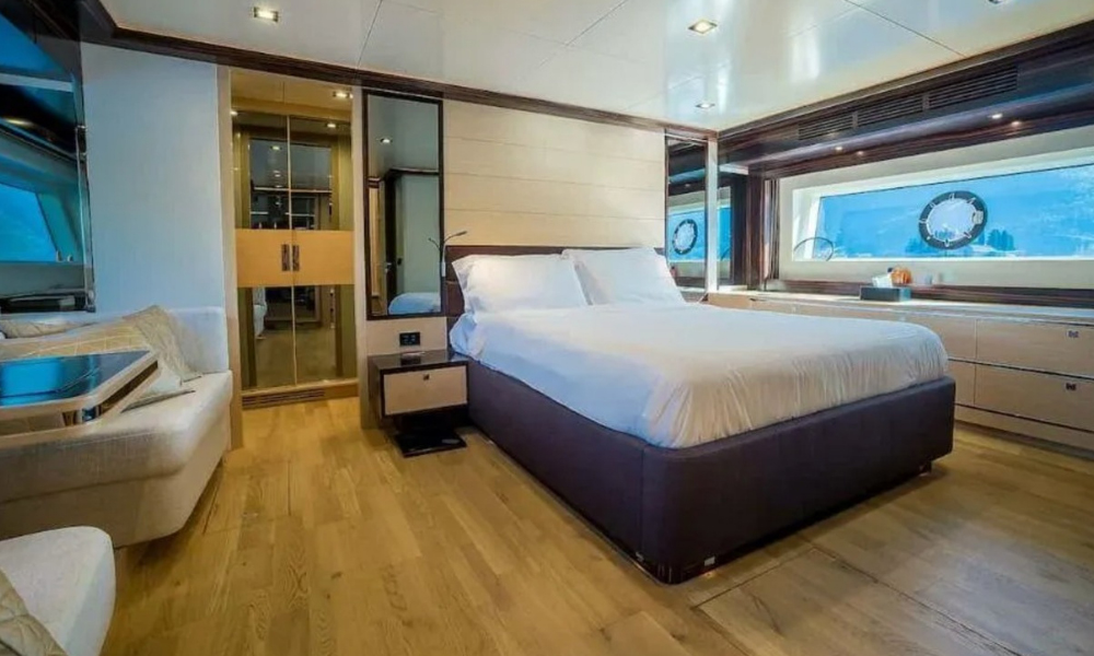 Su distribución está pensada para familias o pequeños grupos, con capacidad para hasta 7 huéspedes en 4 camarotes durante la noche, incluyendo una amplia Master con vestidor. Durante el día puede acoger hasta 12 invitados, lo que la hace perfecta tanto para alquileres de varios días como para salidas de día por la costa de Mallorca.