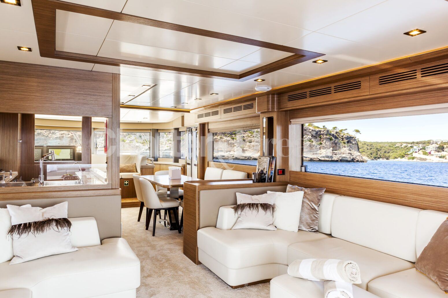 Disfruta de comidas al aire libre en la cubierta de popa, relájate en la amplia zona de proa o sube al flybridge para descansar al aire libre, tomar cócteles al atardecer y navegar contemplando la costa. En el interior, el salón principal es luminoso y contemporáneo, con una cómoda zona de estar y comedor interior. Los estabilizadores Seakeeper garantizan una navegación suave y confortable.